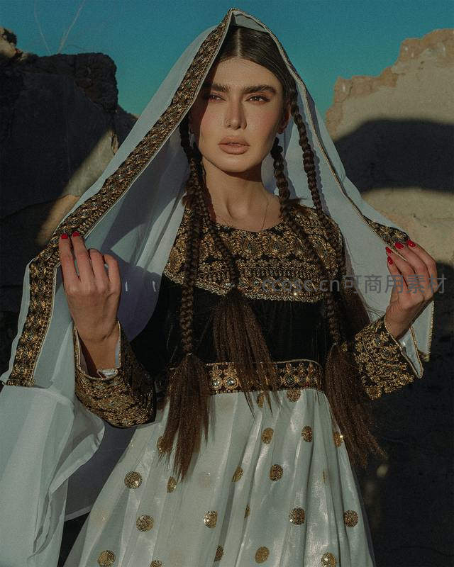 少女轻掀轻盈面纱,露出深邃眼神,身着华丽黑金上衣与波点长裙,背景为荒凉岩石,营造神秘而高贵的氛围。