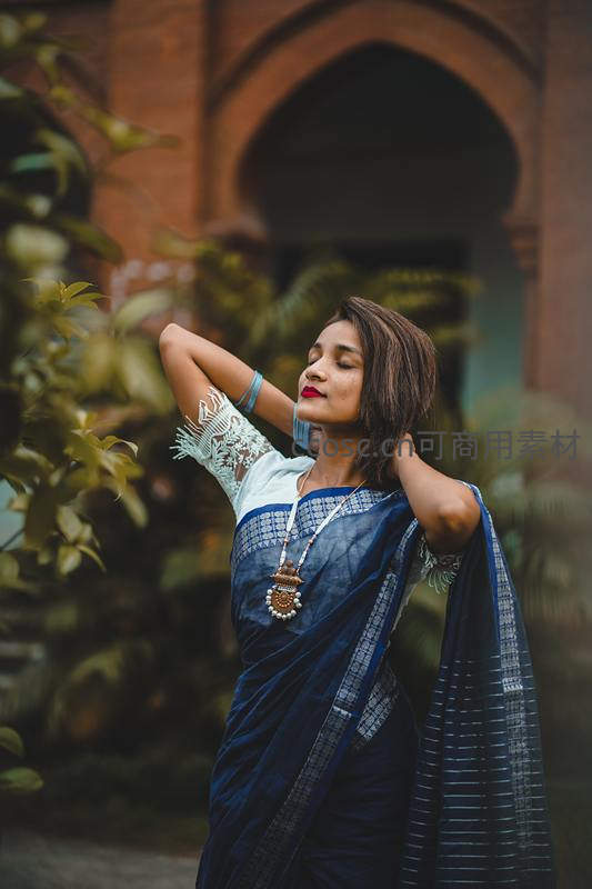 蓝纱丽女子闭目享受庭院时光