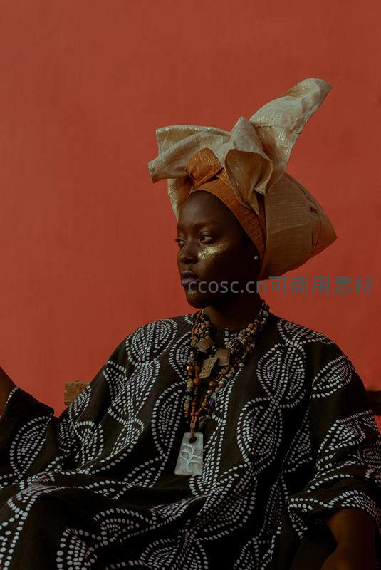 一位非洲女性身着带有白色图案的深色传统服装,头戴精致头巾,面部点缀金色亮粉,在纯红背景下展现出庄重而神秘的气质。