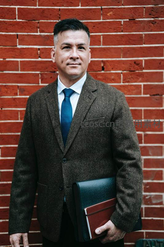一位穿着正式西装、打着领带的男士站在红砖墙前,手中拿着一个皮质文件夹,神情自信。