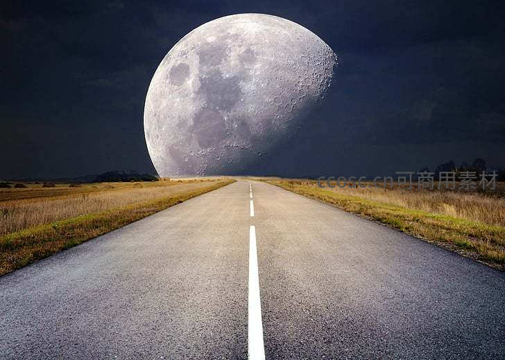 一条笔直的乡间公路延伸至远方,一颗巨大无比的月亮仿佛触手可及,营造梦幻般的视觉奇观。