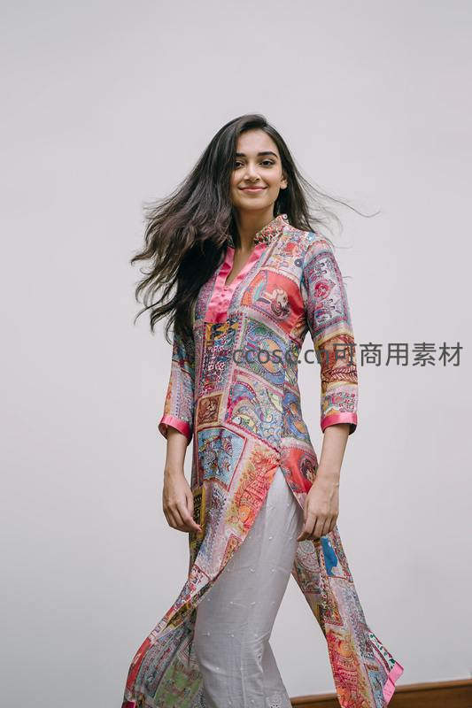 一位身着色彩斑斓异域长袍的女子,长发飘逸,面带温柔微笑,姿态优雅地回眸凝视镜头,背景简洁突出人物魅力。