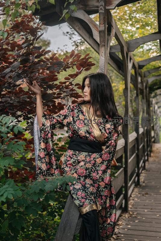 在秋意盎然的庭院木廊下,一位穿花裙的女子轻抬手触碰枝头红叶,姿态柔美,与自然光影交织,展现诗意秋日时光。