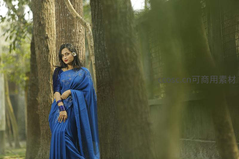 蓝纱丽女子倚树而立,林间光影温柔静谧
