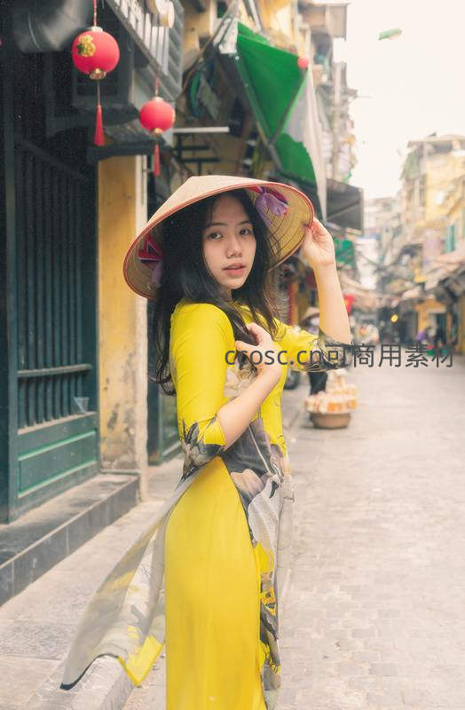 身穿明黄色奥黛的年轻女子,手扶斗笠,站在充满东南亚风情的古老街道上,红灯笼与旧建筑为背景,展现出浓郁的文化与生活气息。