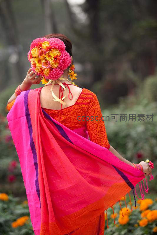 一位身着亮粉色与橙色相间纱丽的女子背对镜头,手持一束鲜艳花束遮住面容,衣袂飘逸,置身于繁花盛开的花园中,充满异域风情。