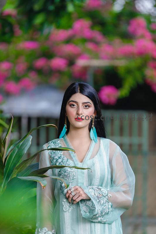 女子身穿浅蓝透明刺绣长裙,佩戴蓝色流苏耳环,静立于盛开的粉色花丛前,双手交叠于胸前,背景虚化突出主体,展现温柔娴静之美。