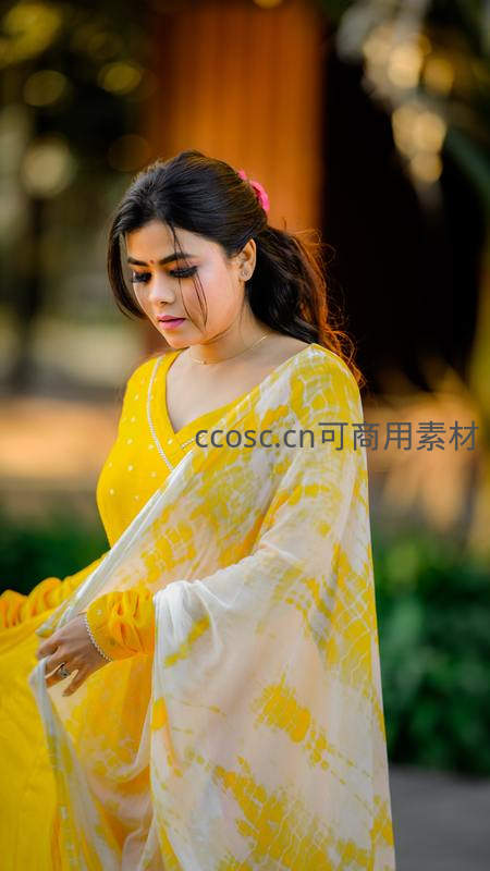 黄白扎染纱丽女子低头凝思于柔光庭院中