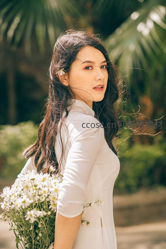 白裙佳人手捧雏菊,热带绿意中回眸一笑倾城