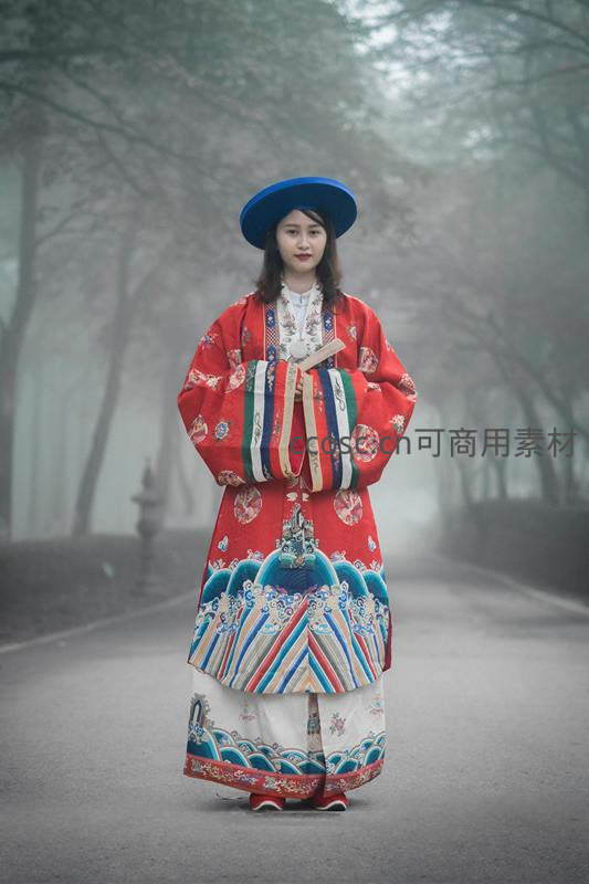 浓雾弥漫的小径上,一位身着繁复精美汉服的女子手持折扇静静伫立,红蓝相间的衣袍在朦胧背景中格外醒目,展现出浓郁的东方古典韵味与庄重气质。