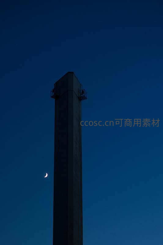 深蓝色的夜幕下,一座高耸的工业塔楼剪影矗立,一弯新月悬于其侧,营造出静谧而略带孤寂的工业美学氛围。
