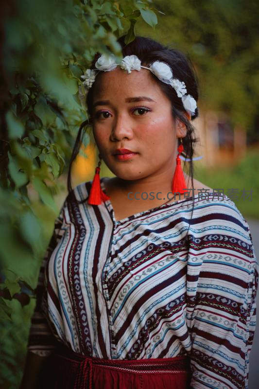 一位身着条纹民族服饰的少女头戴白色花环,佩戴鲜艳红耳坠,在绿意盎然的林间静立凝望,神情恬静而充满故事感。