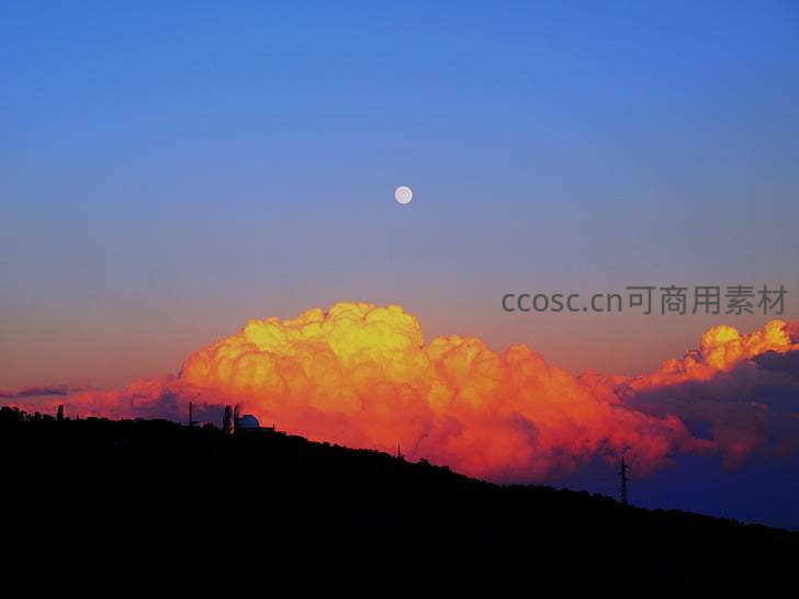 绚烂的晚霞如火般燃烧在天际,巨大的云团被染成金红,一轮皎洁的满月高悬其上,山峦的剪影勾勒出大地的轮廓。
