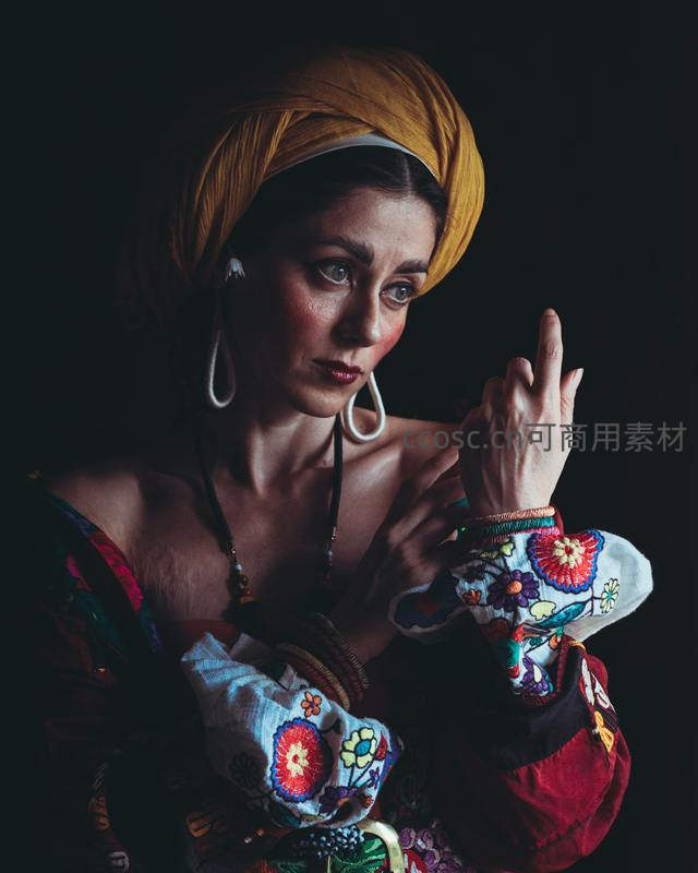 一位身着繁复刺绣服饰、头裹黄色头巾的女子,在暗调光影中伸出手指,目光专注而富有表现力,整体氛围充满戏剧性与复古艺术感。