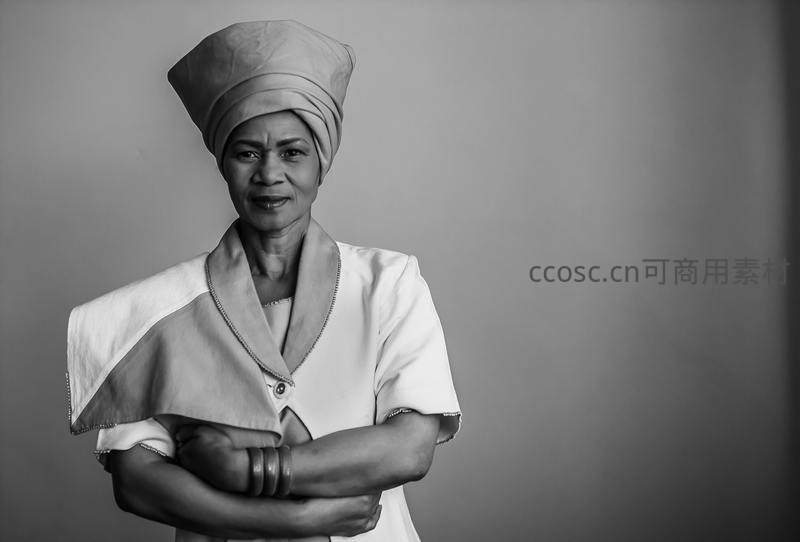 一幅黑白人像作品,展现了一位身着传统服饰、头戴头巾的成熟女性。她双臂交叉,眼神坚定而温柔,流露出内在的沉静与力量,极具人文艺术感。