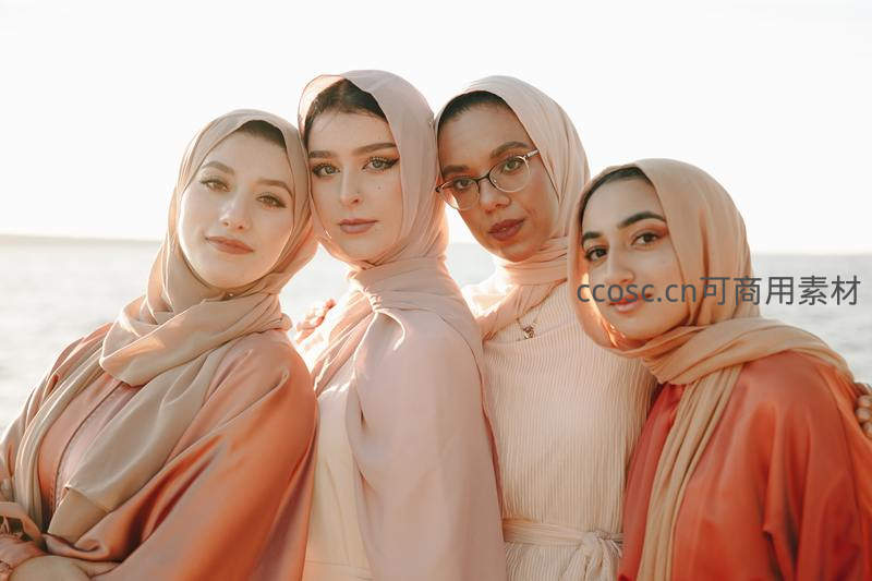 四位佩戴不同颜色头巾的年轻女性在海边亲密依偎,面带微笑望向镜头。阳光洒在她们身上,氛围温暖而欢乐,展现了深厚的友谊与青春活力。