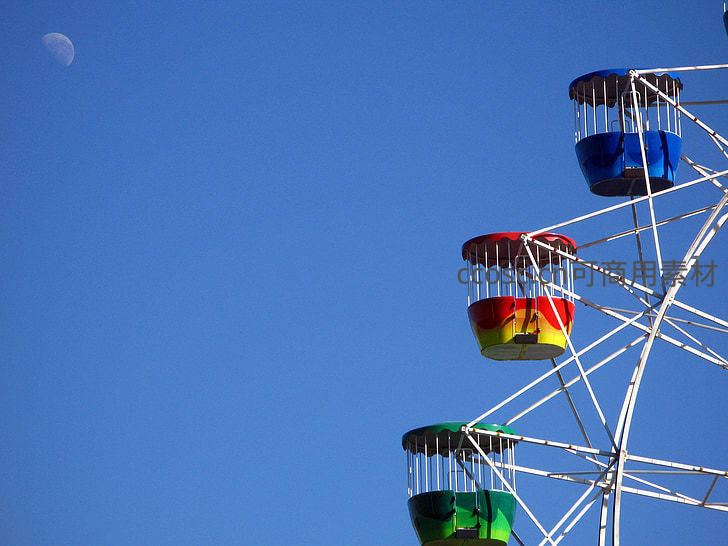 在万里无云的蔚蓝天空下,色彩鲜艳的摩天轮缓缓转动,一弯清新的月牙悄然挂在角落,为欢乐的游乐园增添了一丝诗意。