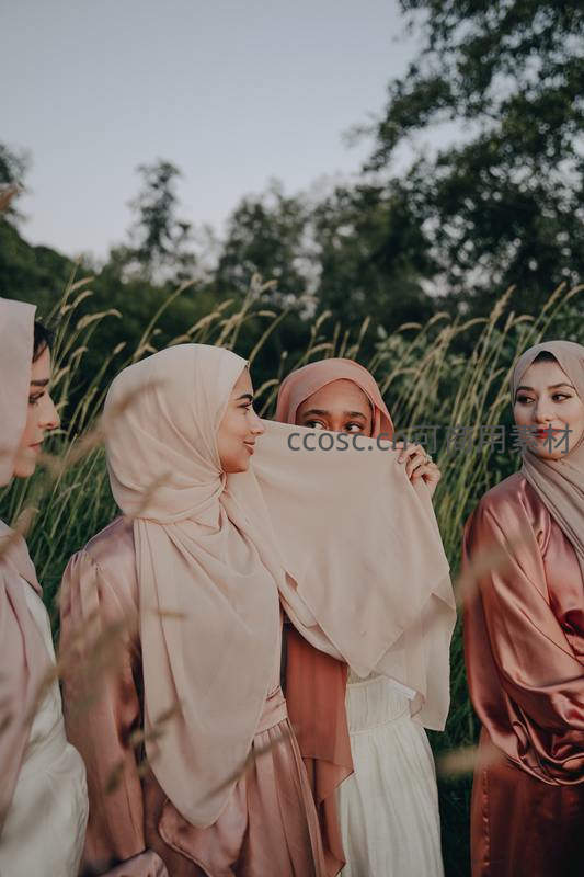 几位身着柔和色系服饰的女子在高高的草丛中嬉笑互动,其中一人用头巾遮面,洋溢着轻松愉悦的青春气息。