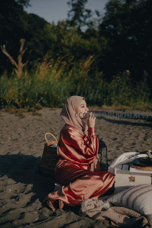 一位身穿丝绸长袍的女子安静地坐在沙滩上,身旁摆放着野餐篮和靠垫,享受着黄昏时分的悠闲与惬意。