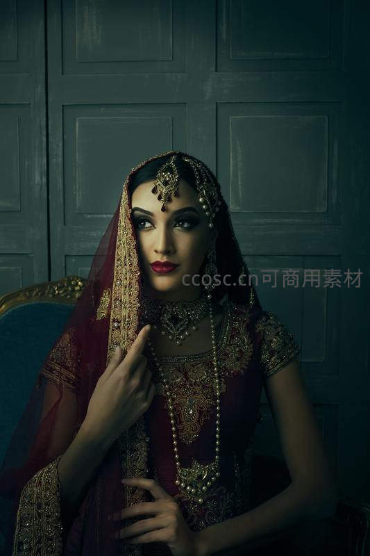 一位身着精美传统服饰的女子,佩戴繁复珠宝,坐在古典背景前,神情沉静而高贵,展现了浓郁的文化韵味与艺术美感。