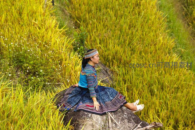 身着绚丽民族服装的少女静坐于梯田边的岩石上,远眺金色稻浪,画面充满宁静与诗意,展现了人与自然和谐共处的美好瞬间。