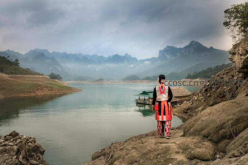 一位身着鲜艳民族服饰的少女背对镜头,伫立在湖边岩石上,凝望远方被薄雾笼罩的连绵群山,画面宁静而富有诗意。