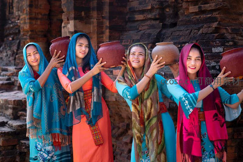 四位身着绚丽传统服饰的女子,在古老砖石建筑前排成一列,头顶陶罐面带微笑,姿态优雅,洋溢着浓郁的文化气息与欢乐氛围。