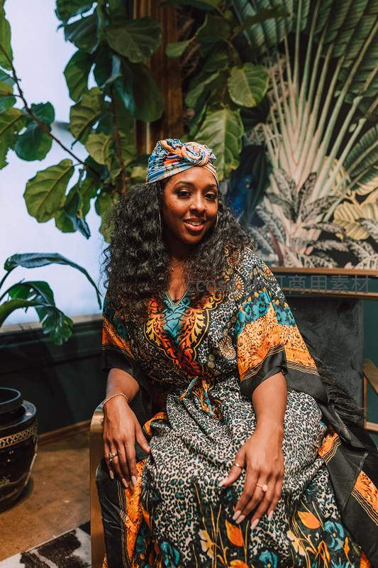 一位笑容灿烂的女性身着多彩民族风连衣裙,头戴同款头巾,坐在绿意盎然的植物旁,散发出温暖、自然与自信的生活气息。