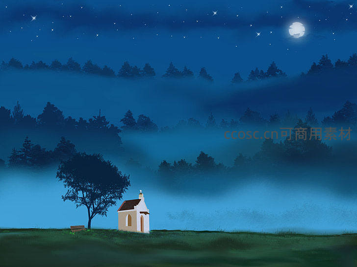 一幅唯美的插画,描绘了月光洒向被薄雾笼罩的森林,一座孤独的小教堂静静伫立在草地上,营造出如梦似幻的童话氛围。