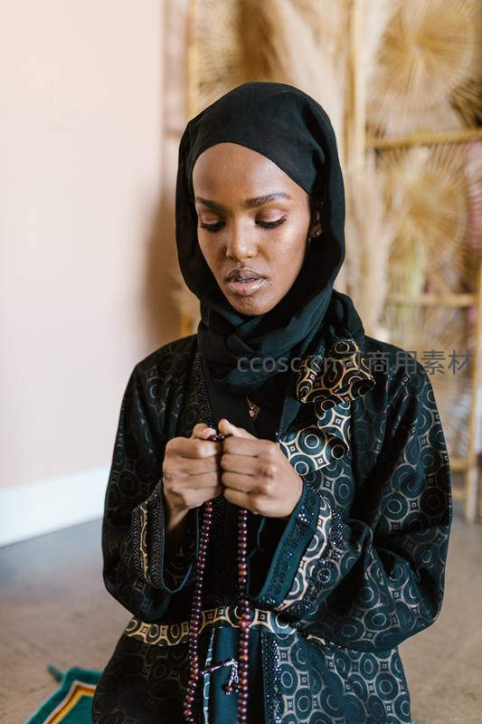 穆斯林女子低头祈祷手持念珠的虔诚时刻