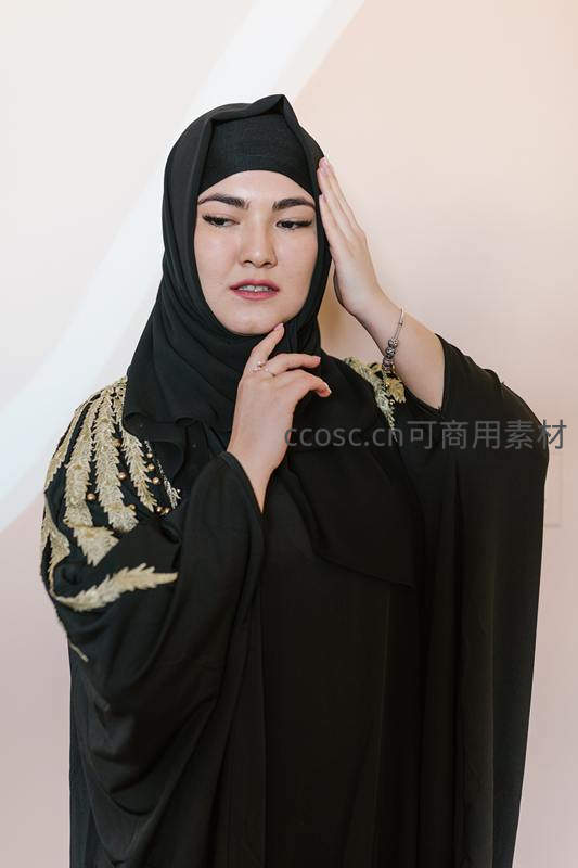 一位身着黑色长袍与头巾的女子,一手轻抚额前,眼神低垂而深邃,金色刺绣点缀肩部,整体氛围宁静内敛,充满艺术感。