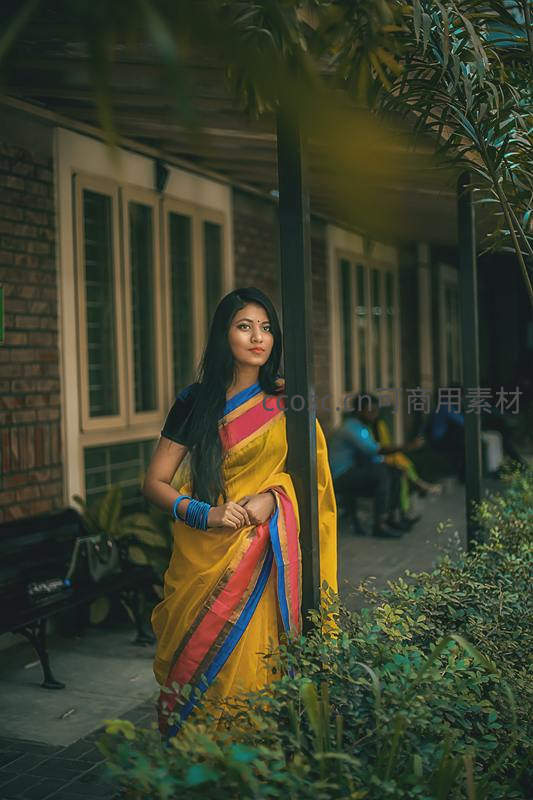 一位身穿鲜艳黄色纱丽的女子站在绿意盎然的庭院中,背景是砖墙与长廊,姿态优雅,眼神温柔,充满异域文化气息。