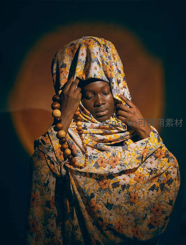 一位非洲女性身披印有花卉图案的头巾,佩戴木质念珠,闭目冥想,背景光晕柔和,营造出宁静而神圣的氛围。