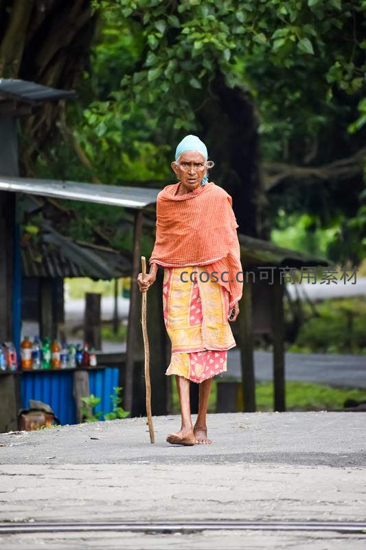 一位头戴蓝巾、身披橙色纱丽的老妇人赤脚拄杖走在乡间小路上,背景绿树成荫,展现出质朴真实的乡村生活画面。