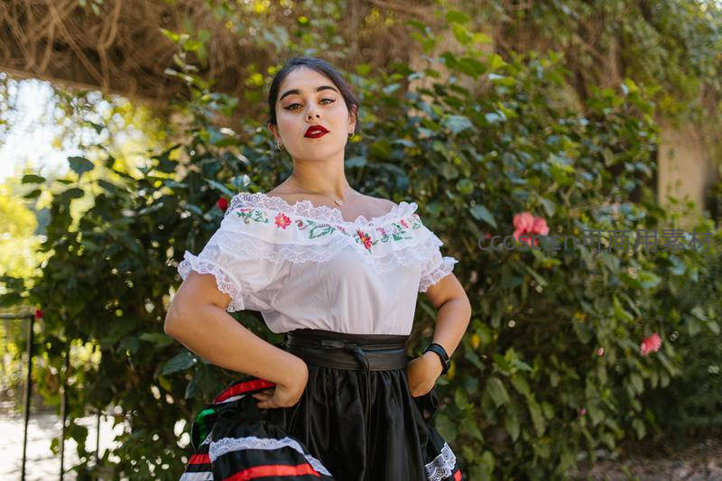 一位年轻女子身穿白色刺绣上衣与黑色长裙,站在繁茂花丛前,姿态自信从容,展现了墨西哥传统服饰的美丽与自然环境的和谐交融。