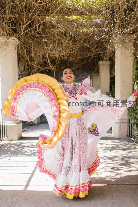 舞者在明媚阳光下旋转,白色绣花长裙如花瓣般绽放,裙摆上葡萄刺绣栩栩如生,笑容灿烂,传递出节日般的喜悦与活力。