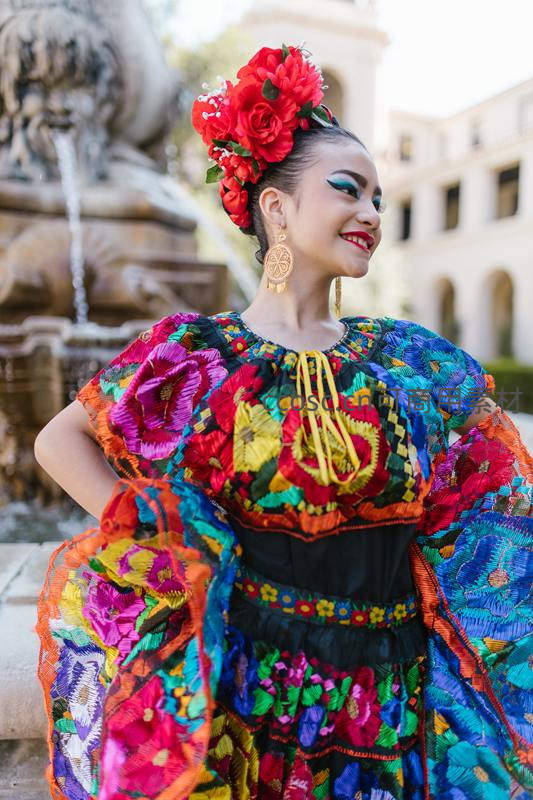 女子头戴鲜艳玫瑰花冠,身着五彩斑斓的刺绣长裙,站在喷泉前微笑回眸,背景是欧式建筑,整体画面洋溢着庆典与艺术之美。