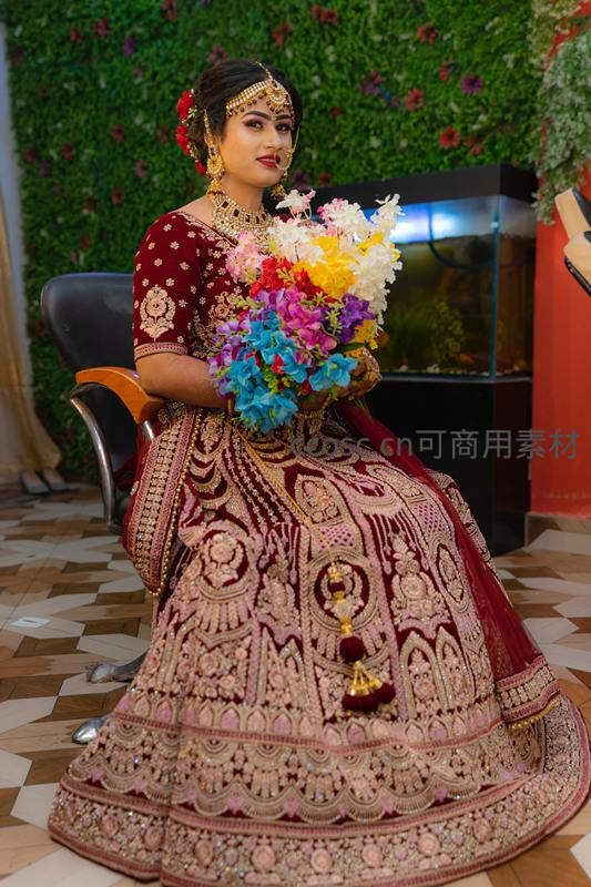 身着华丽酒红色刺绣礼服的印度新娘,佩戴璀璨金饰,手捧五彩缤纷的花束,于室内优雅端坐,尽显喜庆与尊贵。