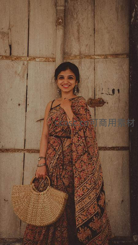 一位笑容灿烂的女士身穿华丽的印花纱丽,手提草编包,倚靠在斑驳的旧木门前,展现了轻松惬意的生活气息与浓郁的异域风情。