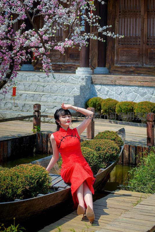 一位穿着红色旗袍的年轻女子悠闲地坐在水边的小船上,头顶是盛开的粉色樱花,身后是古朴的木质建筑,构成一幅唯美的春日画卷。