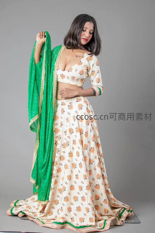 女性舞者轻扬翠绿纱巾,白色花卉长裙随动作飘逸,尽显印度传统舞蹈的灵动韵律与服饰艺术的精致细节。