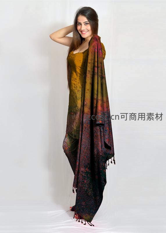 一位长发女子身穿金色吊带上衣,肩披一条从金黄渐变至深紫的华丽印花纱巾,正优雅地侧身回眸,纯白背景衬托出服装的绚丽与她的自信笑容。