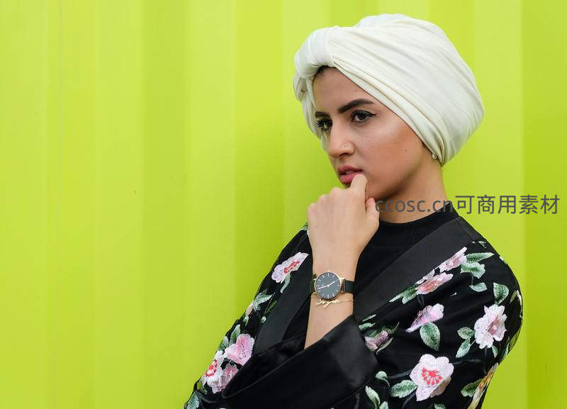 一位佩戴白色头巾的女子,身穿黑色花卉刺绣上衣,手托下巴陷入沉思,身后是明亮的绿色条纹墙面,整体画面充满现代时尚与宁静氛围。
