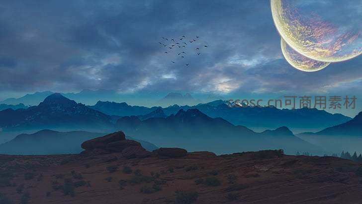 在一片陌生的异星地貌上,连绵的蓝色山脉笼罩在薄雾之中,天空悬挂着两颗色彩斑斓的巨大卫星,鸟群掠过天际。