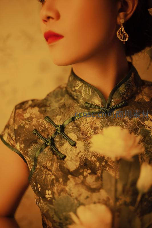 青绿盘扣特写,旗袍细节展现古典韵味