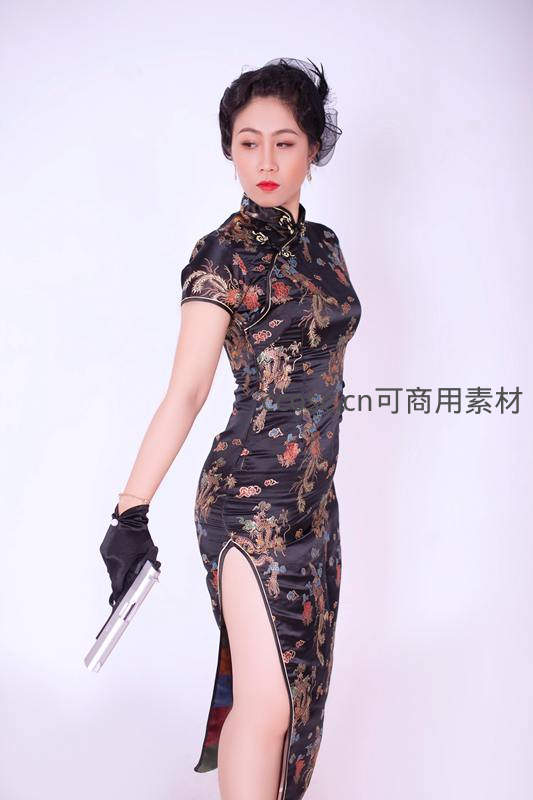 黑金龙纹旗袍女郎,持枪回眸气场全开