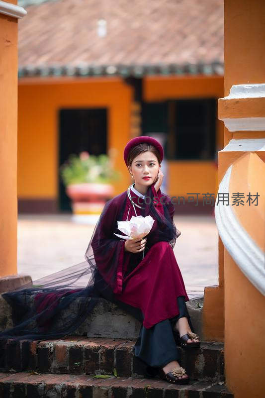 身穿紫黑相间传统服饰的女子,一手托腮,一手持莲,侧坐于砖砌台阶旁,目光望向远方,背景是暖色调的古建筑与绿植,营造出古典而略带忧郁的意境。