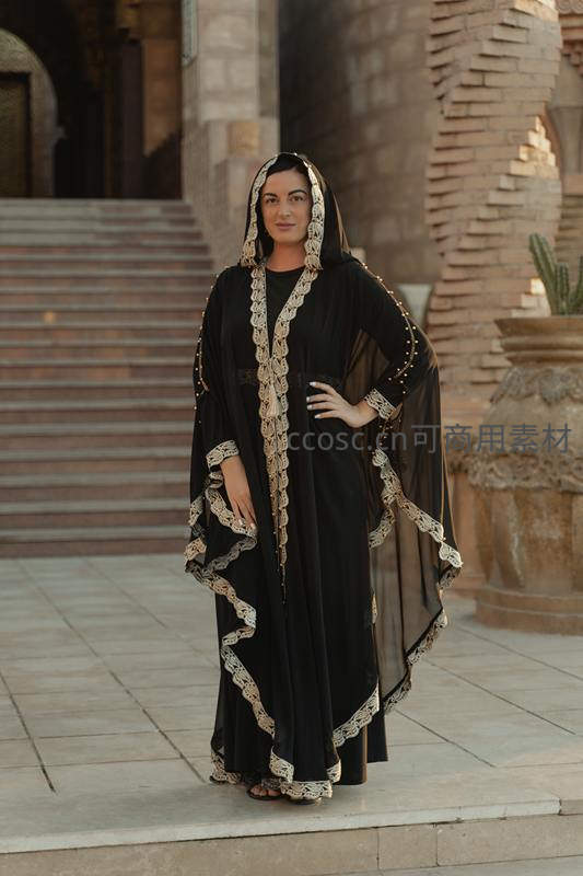 一位穿着黑色镶金边长袍的女子站在具有中东风格的石阶建筑前,服饰华丽,姿态端庄,展现浓郁异域文化风情。