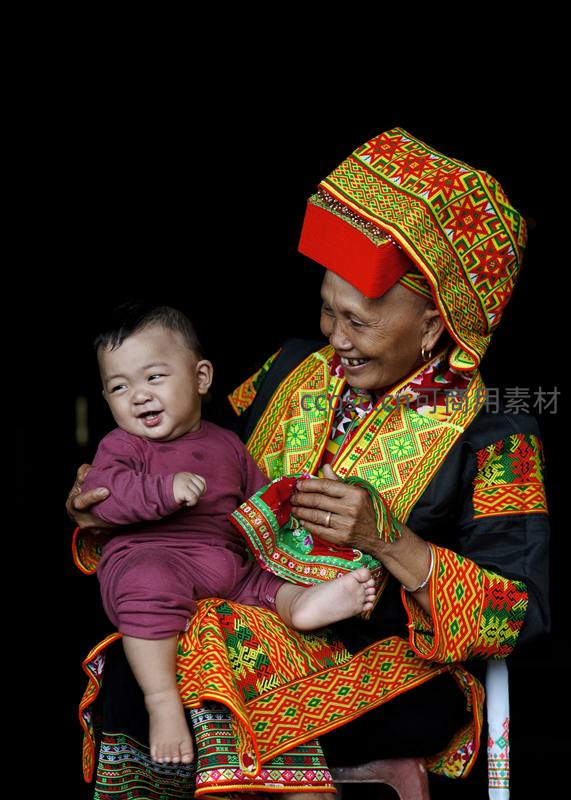 身着鲜艳民族服饰的老奶奶慈祥地抱着一个咧嘴大笑的婴儿,画面充满温暖与文化传承的氛围。