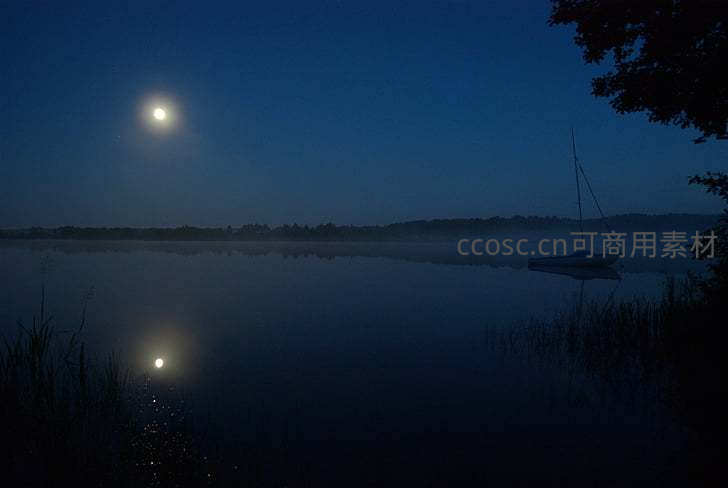 一轮明月高悬于宁静的湖面上空,月光在水波中形成温柔倒影,一艘小帆船静泊于薄雾笼罩的岸边,画面安详而唯美。